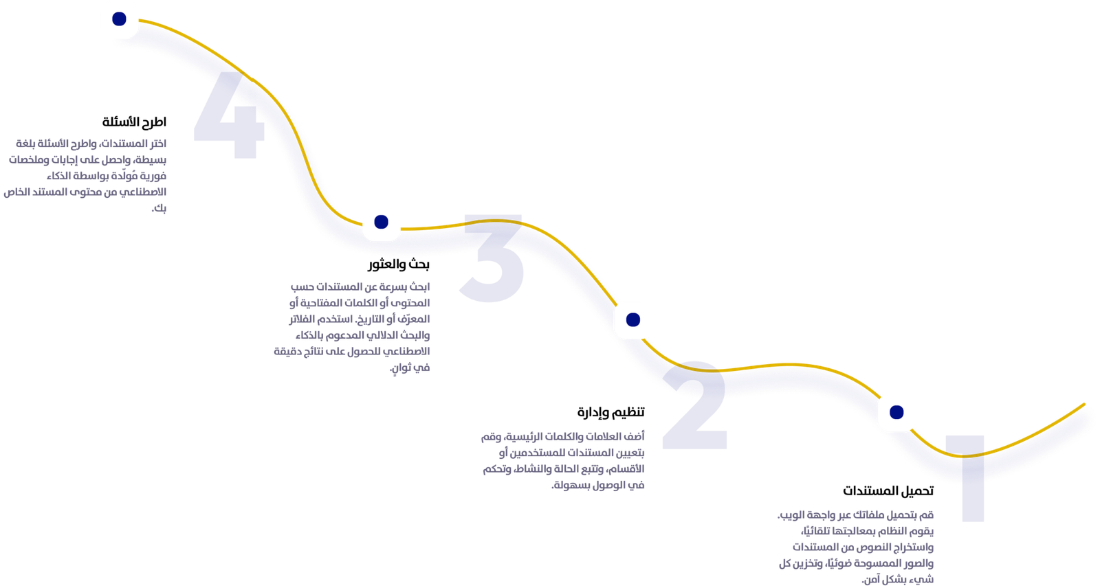 قم بتحميل مستنداتك بسهولة إلى منصة الويب ، حيث يتم تخزينها ومعالجتها بشكل آمن. قم بتنظيم الملفات التي تحتوي على علامات وكلمات رئيسية وعناصر تحكم في الوصول ، ثم ابحث بسرعة عن ما تحتاجه باستخدام بحث قوي يعمل بالذكاء الاصطناعي. اطرح أسئلة بلغة بسيطة واحصل على إجابات أو ملخصات فورية ، مما يجعل إدارة المستندات أسرع وأكثر ذكاءً وكفاءة.